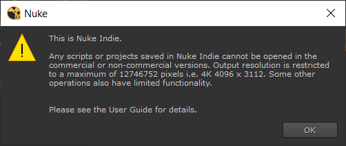 Nuke Indie is a fully functional version of Nuke Studio, but as it's designed for non-pipeline commercial use only, it differs from the full commercial version in some respects. Launching an application in Indie mode displays a warning: