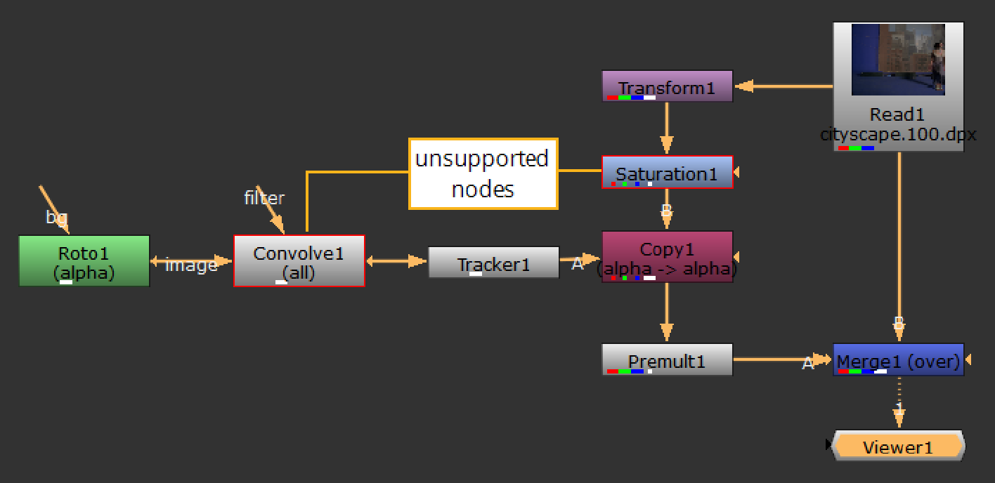 You can load projects created in Nuke's other modes and work as normal, within the constraints of Nuke Assist. The Viewer renders the output of the node tree whether the components are supported or not. Any unsupported nodes and plug-ins in the Node Graph are outlined in red and their controls are grayed out. You cannot modify the output of unsupported nodes and plug-ins.