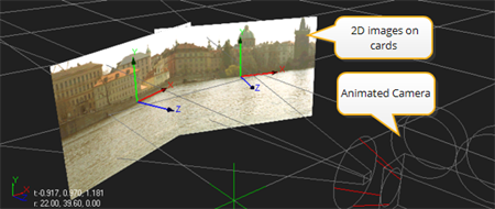 This 3D workspace has countless uses, the simplest of which is generating pan-and-tile scenes. These are scenes with 2D image planes arranged into a curved shape, and then rendered out through an animated camera to give the illusion of a seamless environment.