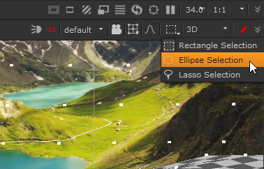 Nuke's Viewer features three selection modes, Rectangle, Ellipse, and Lasso. Selection modes work the same in all Viewer contexts, whether you're in 2D selecting Roto splines or 3D selecting vertices, faces, or objects. The selection mode dropdown is located above the Viewer at the top-right.