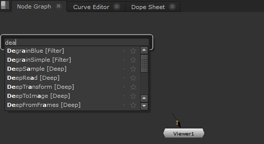 Typing in the Tab menu narrows the selection. For example, entering the string dea displays all entries beginning with dea. In this case, you can see that there are no nodes beginning dea, so Nuke looks instead for node beginning de with an a in the name.
