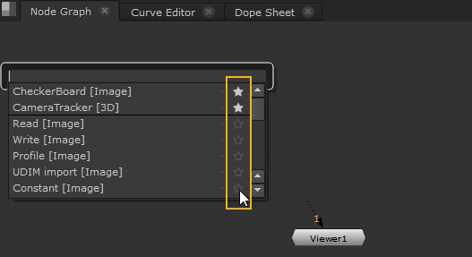 Favorites allow you to mark nodes that you use most often so that they are listed first in the Tab menu. You can add and remove favorites by clicking the star next to their entry in the node list.