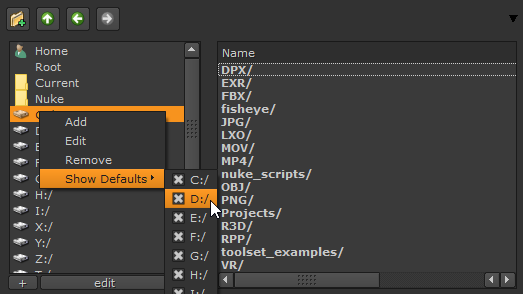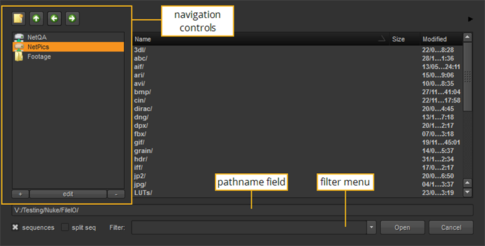 Whenever you load or save files in Nuke, you’ll see a browser similar to the one shown in the image below. The directory navigation buttons let you create or access the directory from which you wish to read or write data.