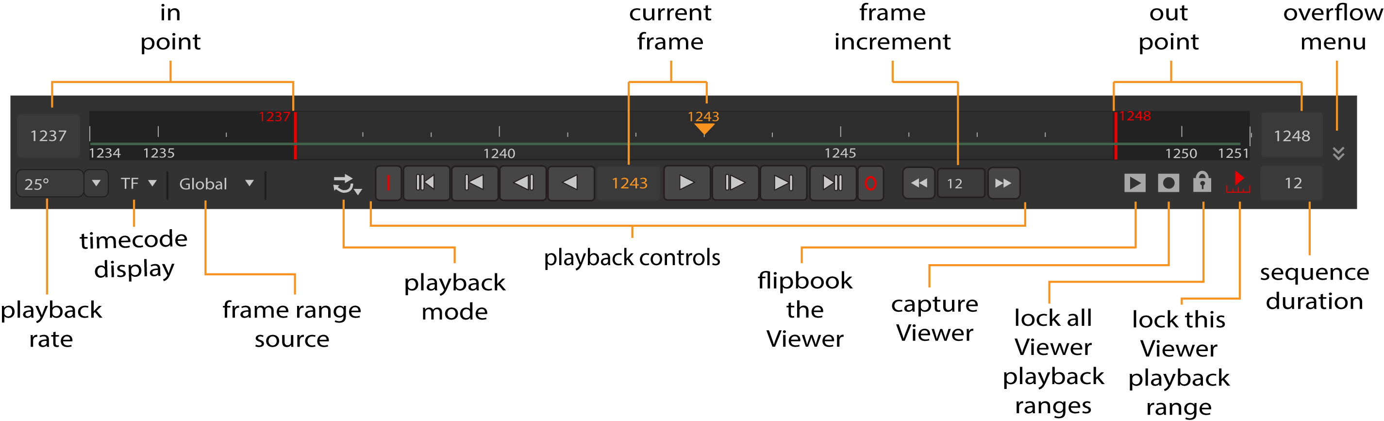 Viewer timeline controls also have a frame range source dropdown menu that you can use to define where the timeline gets its frame range from. You can set this menu to Global, Input, or Custom. Global is the default setting described above.