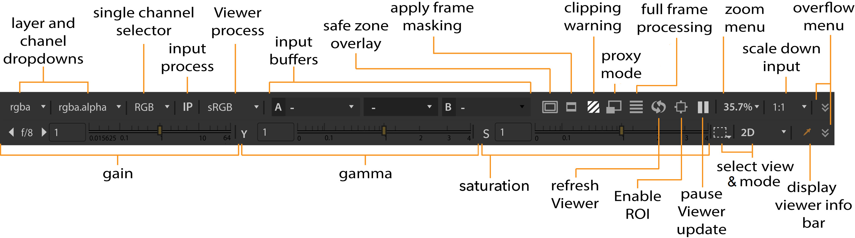 There are many useful tools at the top of the Viewer, some of which allow you to select layers and channels, adjust gain and gamma, and zoom and scale down the image in the Viewer.