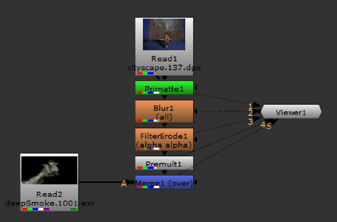 If a Viewer node has multiple inputs, like the one depicted above, you can press the up or down arrow keys to quickly cycle through the views (your cursor needs to be in the Viewer window). To view a particular node press the number key (1, 2, 3... 0) corresponding to the pipe number whose contents you wish to view.