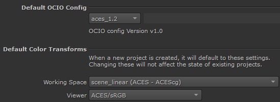 A new ACES 1.2 v1 config has been added, which can be selected in the Preferences and Project Settings > Default OCIO config dropdown.