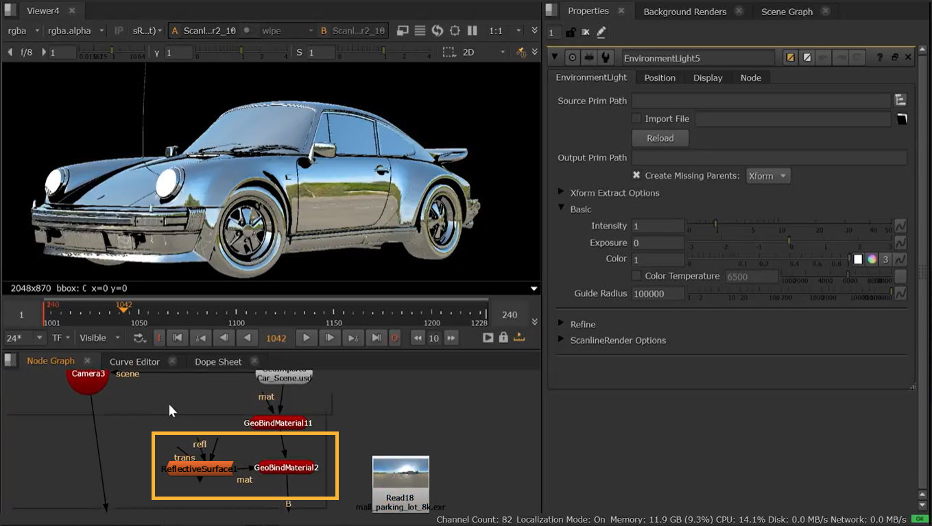 Light an entire scene evenly from all directions and contribute to reflections, with GeoDomeLight, the USD equivalent to the classic system’s EnvironmentLight node.