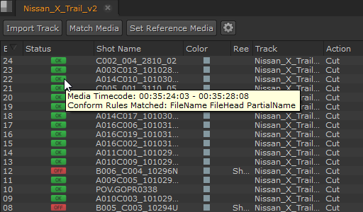Conforming describes the process of matching up the footage from a shoot with the required edit decisions to create a meaningful timeline. Nuke Studio accepts sequences either from EDLs (edit decision lists), OTIO (OpenTimelineIO), AAFs (advanced authoring format), or Final Cut Pro XML files from a specified directory structure containing the source media files. Nuke Studio attempts to conform the media, warning you if there are missing media.