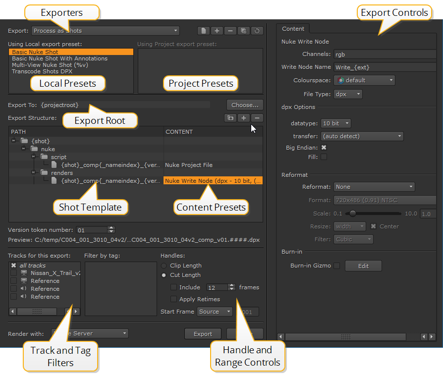 Nuke Studio uses Content Presets in all shot templates, enabling you to create commonly used export conditions, which are then available across all projects. Some presets are only available with certain exporters, for example, the EDL Exporter preset cannot be used with Process as Shots exports.