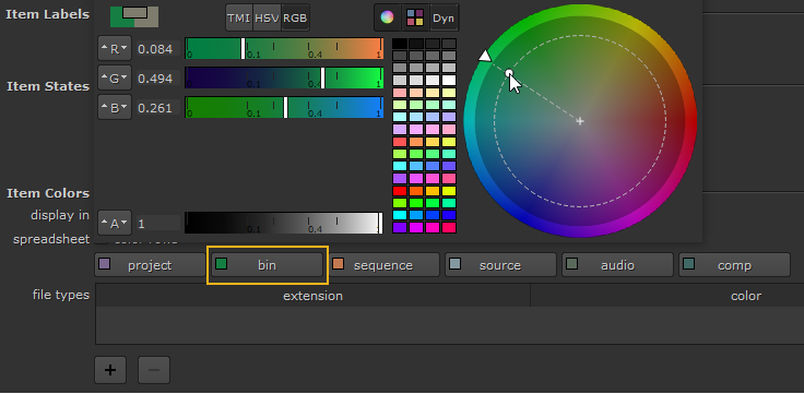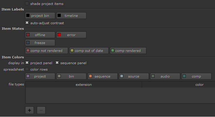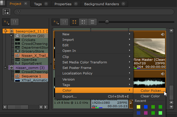 You can set general defaults for items such as bins, sequences, and source clips as well as for specific file types such as .exr or .mov files. You can also set custom colors for individual selections or groups using the right-click menu or color picker button at the top left of the Project panel.