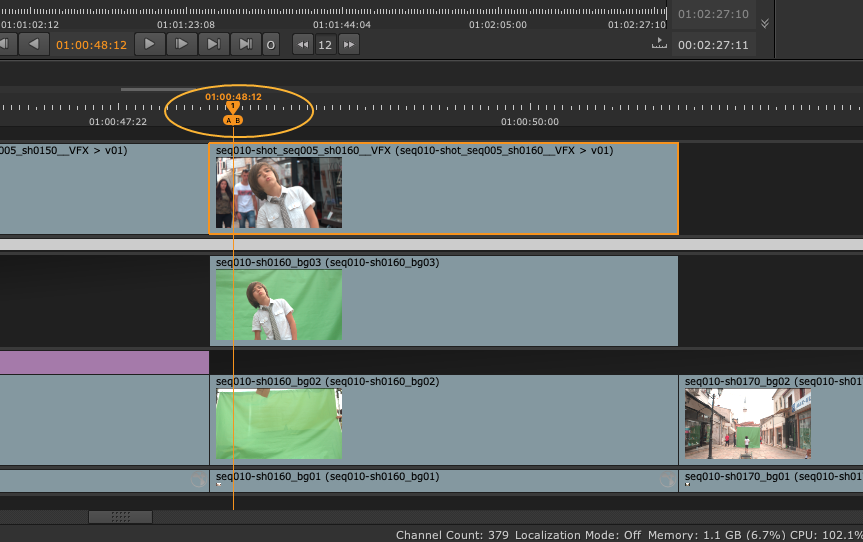 Selecting different tracks to the Viewer’s A/B buffers draws A and B tabs on the playhead in the selected tracks.