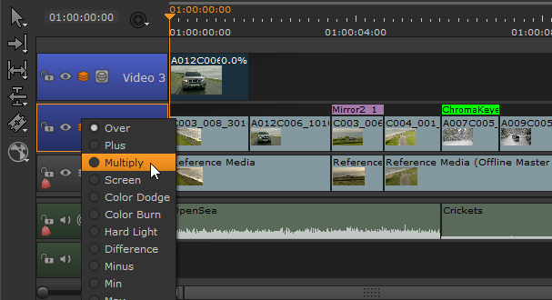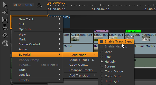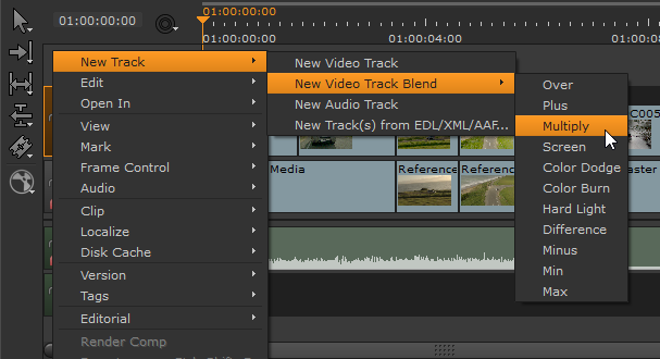 | 1. | Right-click in the timeline, select New Track > New Video Track Blend, and then choose the blend mode to apply. |