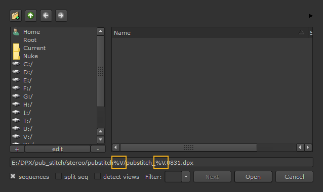If the images you want to read in contain a view name or the initial letter of one (for example, left, right, l or r) in their file names, replace this with the variable %V or %v in the file name. Use %V to replace an entire view name (for example, left or right), and %v to replace an initial letter (for example, l or r). When a variable is used, Nuke Studio reads in the missing inputs and combines all inputs into a single output.