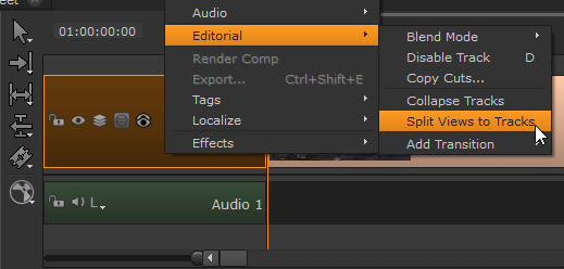| 1. | Right-click a multi-view shot on the timeline and select Editorial > Split Views to Tracks. |