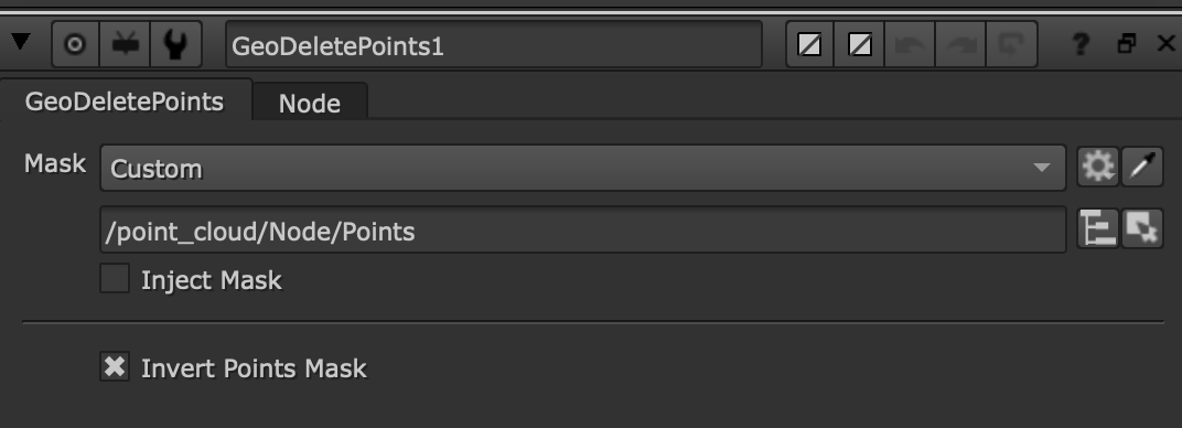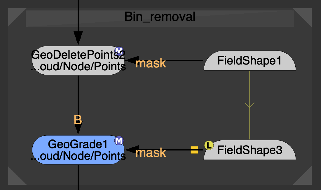 | 3. | This can then be done a second time, using another FieldShape to create a mask for another GeoDeletePoints node. This time the FieldShape targets the specific object to remove in the mask - in this case, the bin in the scene. |