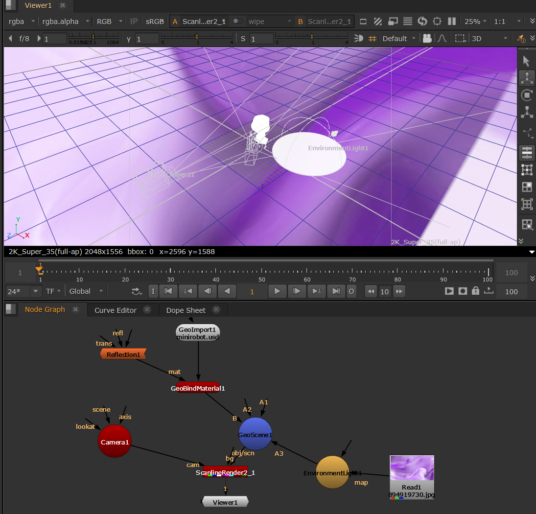 • ScanlineRender Options: These changes will not be visible in the 3D viewport via HDStorm as HDStorm doesn’t provide controls for these yet, but will be visible in your ScanlineRender output. Blur Size allows you to set how much you want to blur the image you are mapping to the light, and Mirror X and Mirror Y will let you flip and flop the image being mapped. You can always opt to create a blur or mirror nodes to do this in the node graph also.