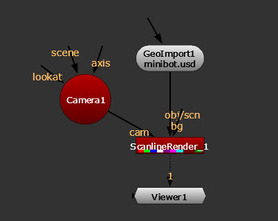 Cameras can then be connected to any node with a cam input, such as ScanlineRender. The camera connected to the ScanlineRender node is the camera used for rendering.