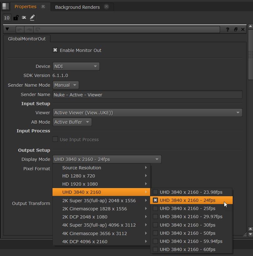 Set the Display Mode for the receiver device of the NDI stream. If you don't change this, Nuke broadcasts the source resolution of the project over NDI. However, this format may not be supported on the receiving device, so you can set the NDI stream to scale to a specific resolution and frame rate here.