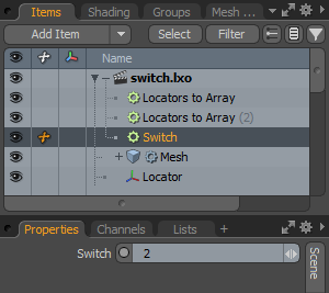 切换通道修改器的工作方式与弦开关和数字开关修饰符。您可以将多个输入连接到单个连接,并使用索引通道指定将哪些输入写入输出。但是,与“字符串和数字”开关修饰符不同,“开关”可以对任何值类型进行操作。