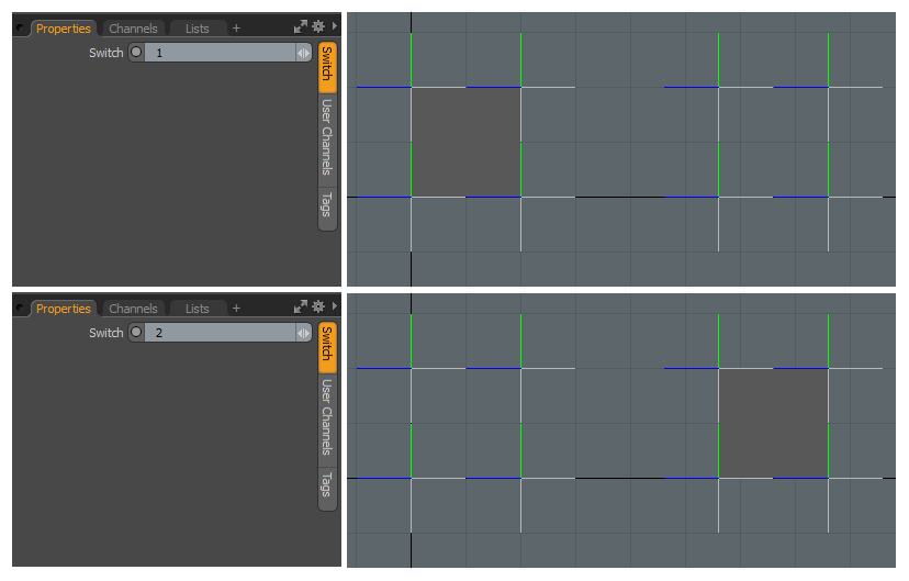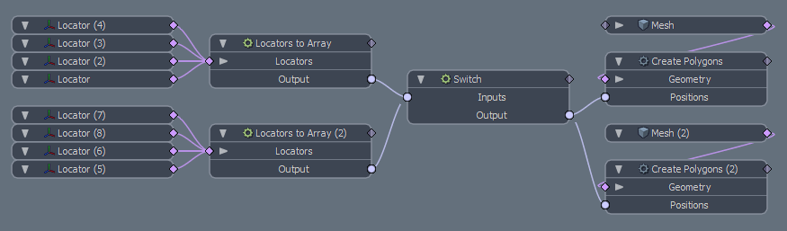 | 4. | 点击Switch示意图中的节点,以及Properties在右侧面板上,设置Switch属性为要查看的输出的索引。在这种情况下,设置Switch至1使用第一组定位器绘制多边形,同时选择2使用第二组定位器绘制多边形。 |