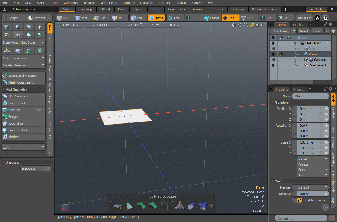 | 3. | 激活Polygons选择模式或Items选择模式,然后选择Plane。 |