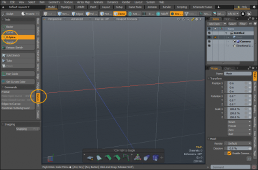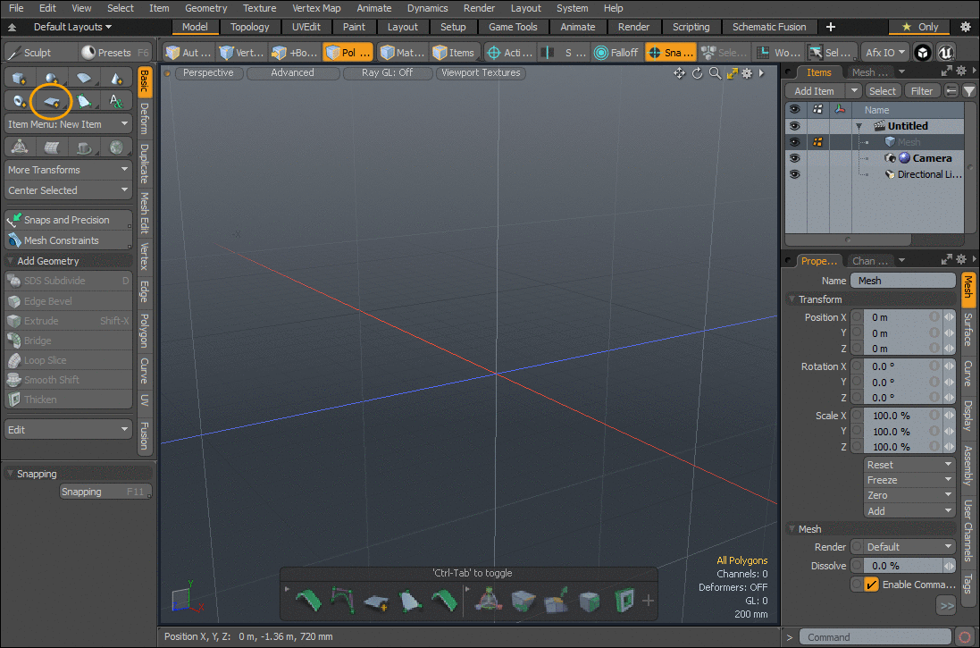 在此示例中,我们添加了Curve和Mesh项目到我们的场景。每个人在Mesh Ops清单。的Mesh项目用于沿着由创建的曲线创建轮廓B-Spline Extrude工具。