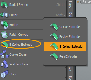 工具箱工具显示最后使用的工具。要激活B-Spline Extrude工具,打开Duplicate在工具箱的子标签中,右键单击当前工具下方的下拉箭头Extrude工具。从菜单中选择B-Spline Extrude查看工具选项。