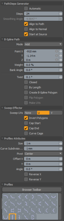 在此示例中,我们添加了Curve和Mesh项到我们的场景,它们在Mesh Ops清单。的Mesh项目用于沿着由创建的曲线创建轮廓B-Spline Extrude工具。