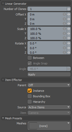 确定源网格Modo克隆。 • Active Items -使用当前选定的项目作为克隆源。 • Specific Item -指定网格项作为基于Mesh Item信息。 • All BG -合并所有当前可见的背景项目并将其克隆为单个网格。 • Random BG -从每个克隆位置的所有当前可见背景项目中选择一个随机背景项目。 • Mesh Layer Preset -克隆在“预设浏览器”中选择的网格预设。打开预设浏览器(通过按F6),然后在激活工具之前选择一个网格预设。 |