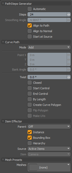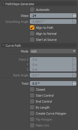 除了PathSteps Generator和Curve Path属性中所述曲线克隆主题,以下属性可用于“曲线实例”工具: