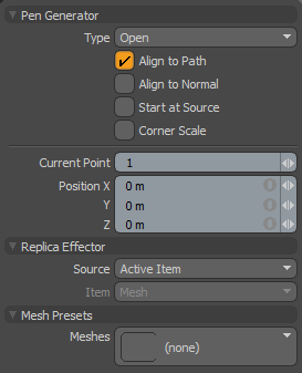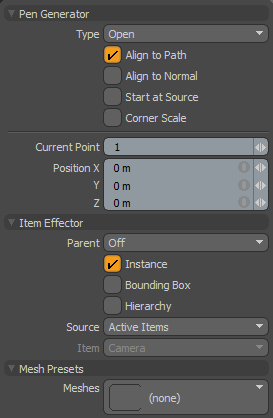 确定源网格Modo沿路径克隆。 • Active Items -使用当前选定的项目作为克隆源。 • Specific Item -指定网格项作为基于Mesh Item信息。 • All BG -合并所有当前可见的背景项目并将其克隆为单个网格。 • Random BG -从每个克隆位置的所有当前可见背景项目中选择一个随机背景项目。 • Mesh Layer Preset -克隆在“预设浏览器”中选择的网格预设。打开预设浏览器(通过按F6),然后在激活工具之前选择一个网格预设。 |