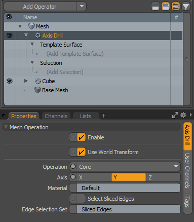的Axis Drill该工具也可以在Mesh Operations清单。打开Mesh Ops标签,点击Add Operator,然后选择Mesh Operations > Edit > Axis Drill。的Create Axis Drill Mesh Operator显示对话框。来自Template Surface下拉列表,在场景中选择一个网格,然后单击OK。