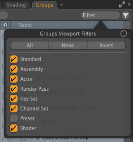 注意:  在此上下文中使用的组不应与组定位器项,这是一个纯粹的组织结构,还有“材料”组,它们定义了用于表面着色的蒙版并组织了许多Shader Tree层。
