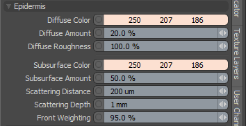 确定吸收,散射和反射回的光的颜色。表皮是相当透明的,并且表面下的颜色基本上与表皮的颜色相同。 Diffuse Color为人类的皮肤。 |