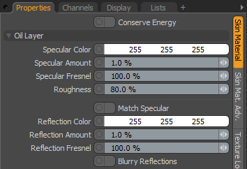 为了获得最佳效果, Skin Material应该放在上方MaterialItem它正在替换(可以随意禁用或删除Material Item)。定位后,选择Skin Material项目在Properties可以调整其设置以微调渲染皮肤外观的视口。皮肤在整个表面上并不是一致的颜色,因此您可能需要添加纹理层,并设置适当的效果以代表皮肤固有的自然变化,以产生最真实的效果。有许多特定于Skin Material下Custom Material Channels > Skin Material Channels对应于Skin Material本身。