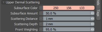 确定反射回去的散射光的数量。地下散射与Diffuse Color产生最终的表皮层。 |
