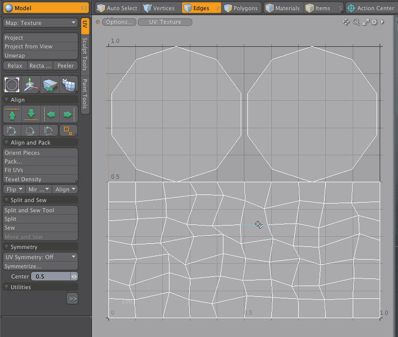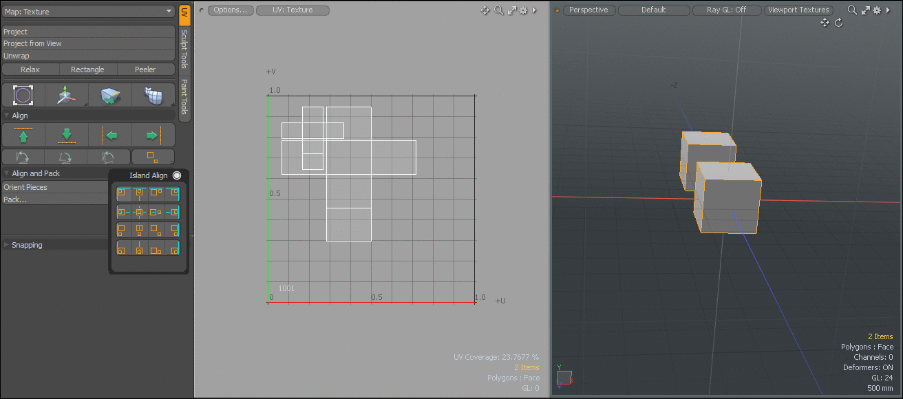 Modo提供了一个简单的工作流程来一次对齐选定的UV岛。
