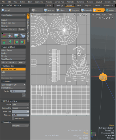 Split and SewTool允许您通过在UV上拖动鼠标来更改UV的布局。该工具的作用就像画笔,半径控制结果。 将工具设置到UV空间中的顶点上,将“模式”设置为Split,将它们分开,画笔半径控制它们与起始位置的偏移量。举行Shift右键单击并在顶点上拖动鼠标的同时将键缝合在一起。或者,将模式设置为Sew然后单击顶点将边缘缝合在一起。