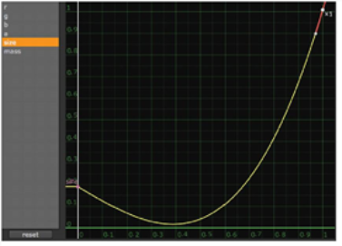 使用ParticleCurve,您可以将一条曲线应用于粒子属性(例如大小或质量)以随时间改变它们。