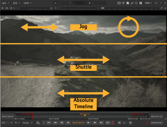 • K+拖动Viewer的中间三分之一-标准穿梭控件。向左和向右拖动光标可以向后和向前播放,并向查看器的边缘增加帧速率。